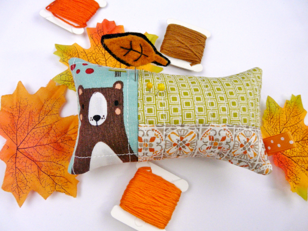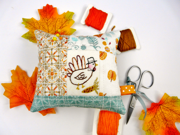 Make these super easy and quick pincushions with scraps of fun fabric. Learn how to embroider a pilgrim turkey ready to celebrate Thanksgiving. Incorporate your small embroidery into a fun pinnie which makes a great gift. Sew up any of these cute sizes with tips to make them & machine quilt them in a flash! Each have a cute ribbon loop to attach your small scissors to it and decorative Leaf pins.