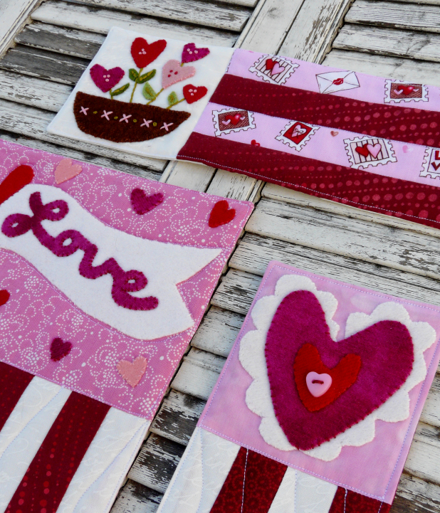 These 3 lil quilts are just perfect for your Winter Decor. There is a hearts in basket mat, Big heart hanging mini quilt and a "Love"banner on a larger mini quilt. All three feature wool and fun fabric.